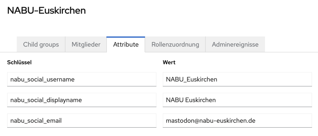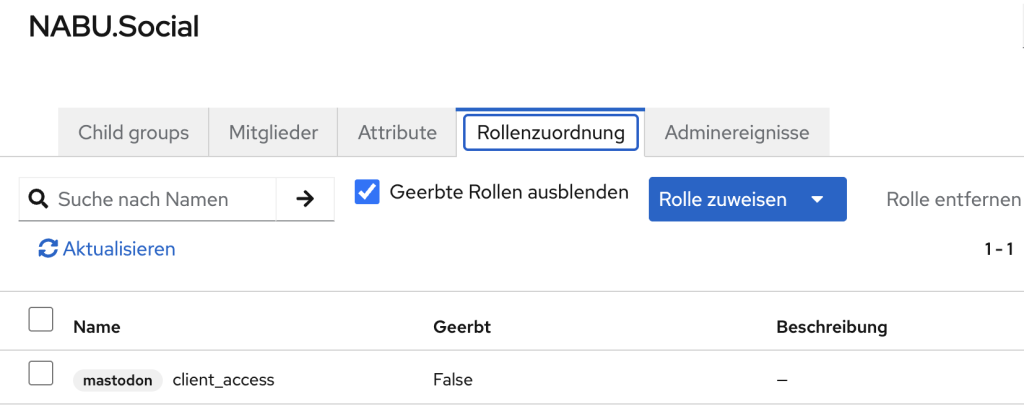 In der übergeordneten NABU.Social Gruppe wird unter Rollenzuordnung die client_access Rolle des Mastodon Clients ausgewählt. Dadurch erhält jeder User in dieser Gruppe und den Kindergruppen (also den NABU Gliederungen) diese Rolle mit der Erlaubnis Mastodon zu benutzen.