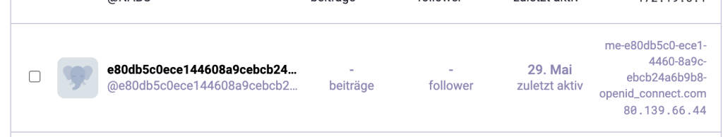 Es besteht jetzt allerdings noch das grundlegende Problem, dass jeder User mit NABU Login Konto sich ein NABU.social Account anlegen können. Hier fehlen dann natürlich die Attr. im ID Token, da der User nicht in der passenden Gruppe ist. Allerdings ist das Mastodon relativ schnuppe. Der legt dann ein Konto mit einem Hash als Usernamen an.