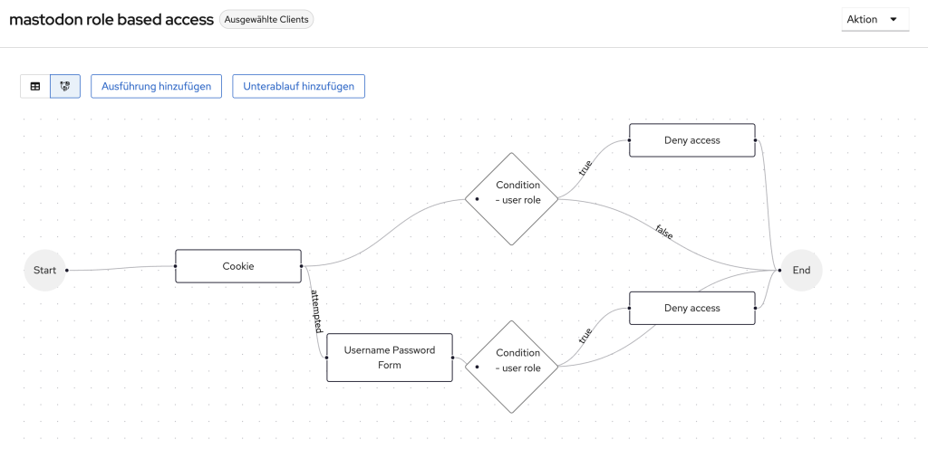 In Keycloak gibt es die Möglichkeit mittels Authentications Flows den Ablauf eines Login Prozesses genau so bestimmen und zu konfigurieren. Der Login kann also verhindert werden, wenn dem User bspw. eine Client Rolle fehlt. Dieser Flow läßt sich auf einzelne Clients anwenden und sogar als nettes Ablaufdiagramm darstellen.
